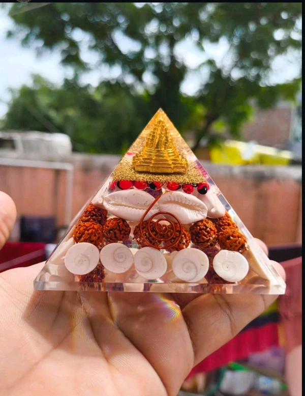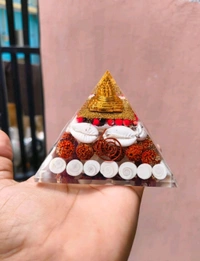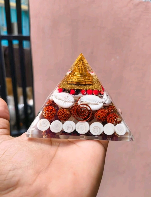 A powerful spiritual pyramid crafted with Rudraksha beads, natural Shankh (shells), spiral energy coil, and a golden structure on top. Ideal for positivity, meditation, and vastu correction.